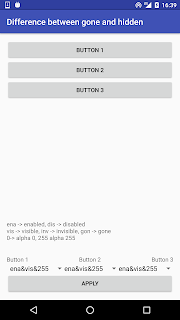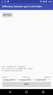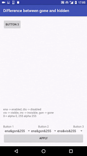 Działanie pierwszego jest oczywiste, przycisk ma pozostać normalnie widoczny. Czym się różnią drugi i trzeci? W przypadku w którym zostanie wybrana niewidzialność, nasz obiekt zniknie, ale zajmowane przez niego miejsce pozostanie puste, tak jak by dalej tam był, tylko po prostu niewidzialny. Z kolei, jeśli wybierzemy View.GONE, obiekt zniknie całkowicie. Stworzyłem małe demo obrazującego jak to działa: