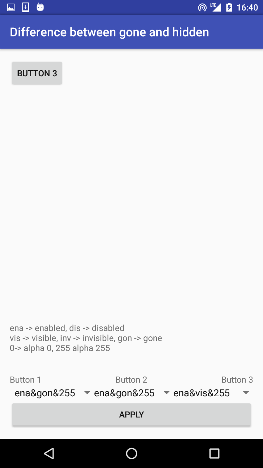 Działanie pierwszego jest oczywiste, przycisk ma pozostać normalnie widoczny. Czym się różnią drugi i trzeci? W przypadku w którym zostanie wybrana niewidzialność, nasz obiekt zniknie, ale zajmowane przez niego miejsce pozostanie puste, tak jak by dalej tam był, tylko po prostu niewidzialny. Z kolei, jeśli wybierzemy View.GONE, obiekt zniknie całkowicie. Stworzyłem małe demo obrazującego jak to działa: